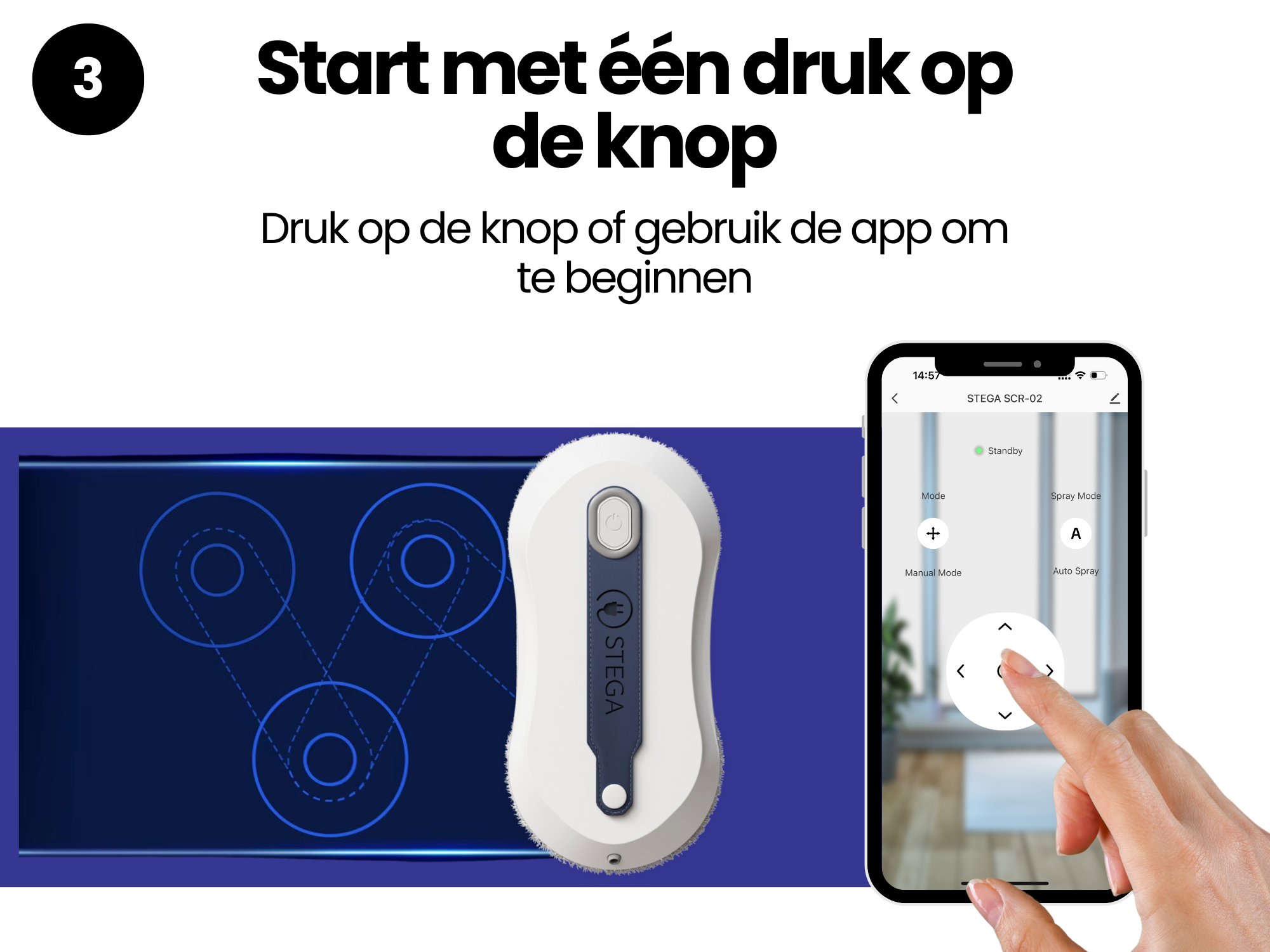 Easily control the STEGA Automatic Window Cleaner SCR-02 remotely. With the included remote control or the user-friendly app, you select the cleaning mode and let the robot do the work. Effortless operation, wherever you are, for a perfect result!