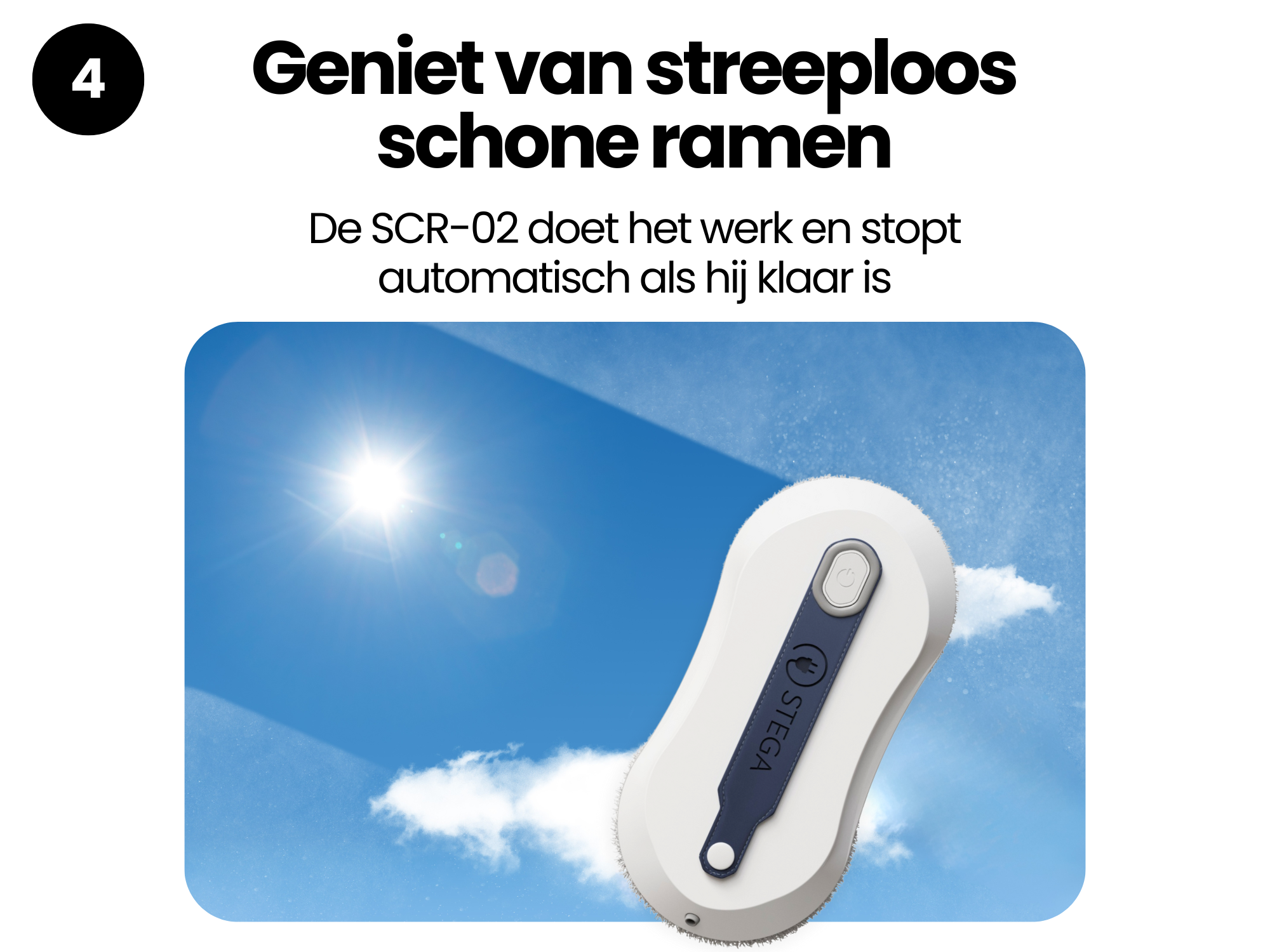 No more hassle with manually spraying water on windows! The STEGA® SCR-02 is equipped with an advanced ultrasonic water sprayer that evenly distributes a fine mist over the window. This effectively loosens dirt and cleans windows streak-free, without you having to put in any extra effort. This not only saves time, but also ensures a deeper and more even cleaning.
