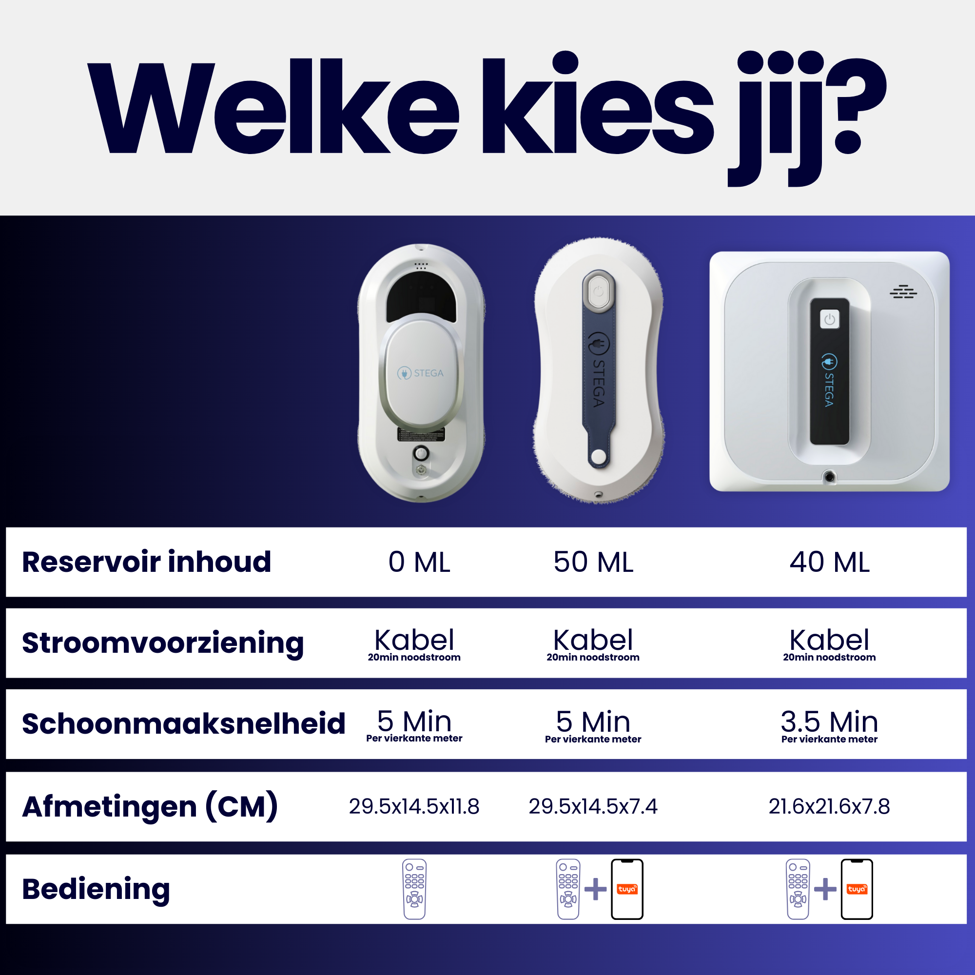 Choose the STEGA Automatic Window Cleaner that suits your needs! Compare tank capacity, cleaning speed and operation to find the ideal match. Whether you want speed, an integrated water tank or compact dimensions – with STEGA you are assured of efficient and effortless window cleaning!
