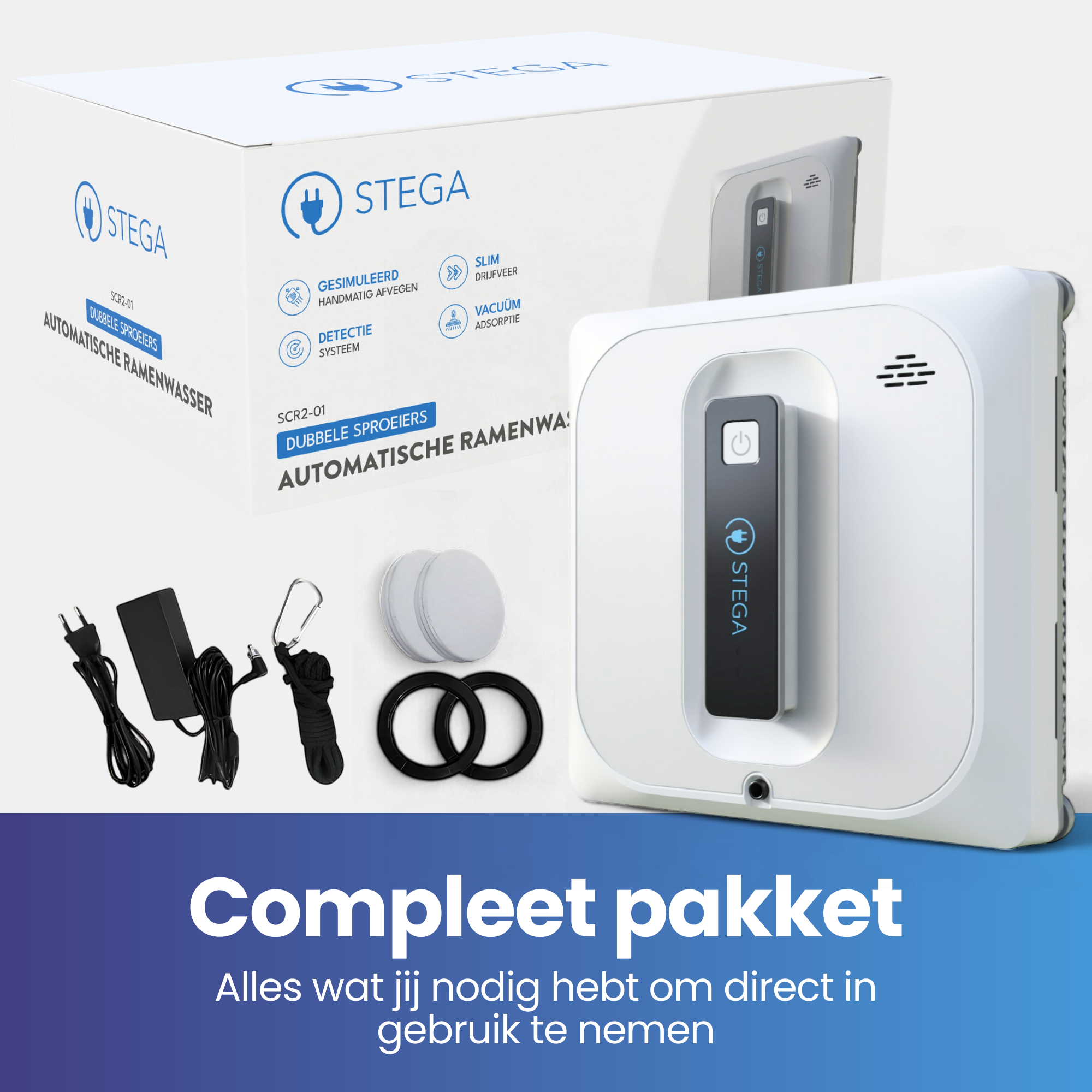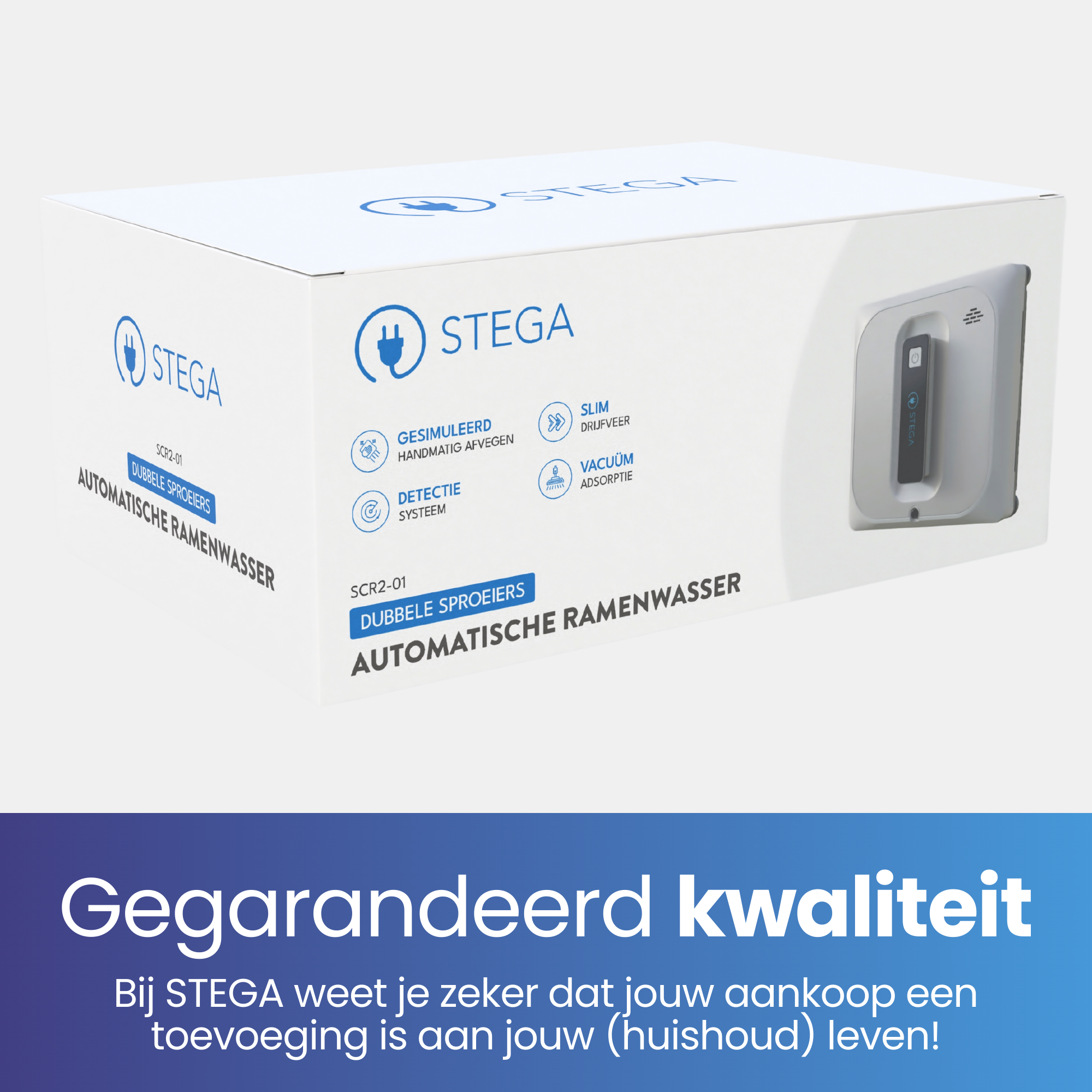 The STEGA Automatic Window Cleaner SCR2-01 combines innovation and efficiency for a streak-free clean result. With double nozzles, vacuum adsorption and a smart detection system, it effortlessly cleans every glass surface. Reliable, powerful and a valuable addition to your household!