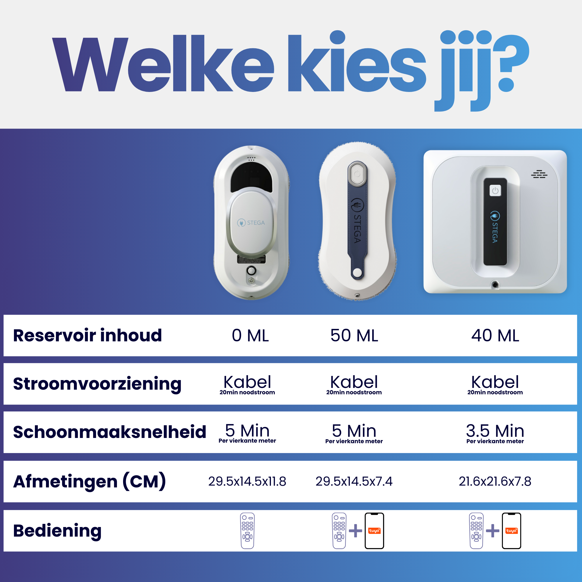 Choose the STEGA Automatic Window Cleaner that suits your needs! Compare tank capacity, cleaning speed and operation to find the ideal match. Whether you want speed, an integrated water tank or compact dimensions – with STEGA you are assured of efficient and effortless window cleaning!